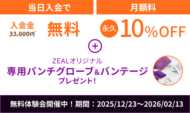 ※ 入会金&翌月会費の特典は、体験当日にご入会された場合に適応されます。